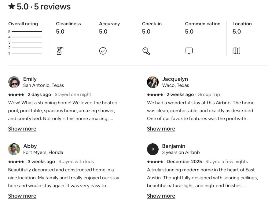 Guests on multiple platforms have consistently highlighted our homes for thoughtful design, comfort, cleanliness, and standout amenities, from architect-designed spaces to resort-style outdoor living. This was a big reason we decided to offer a direct booking experience.