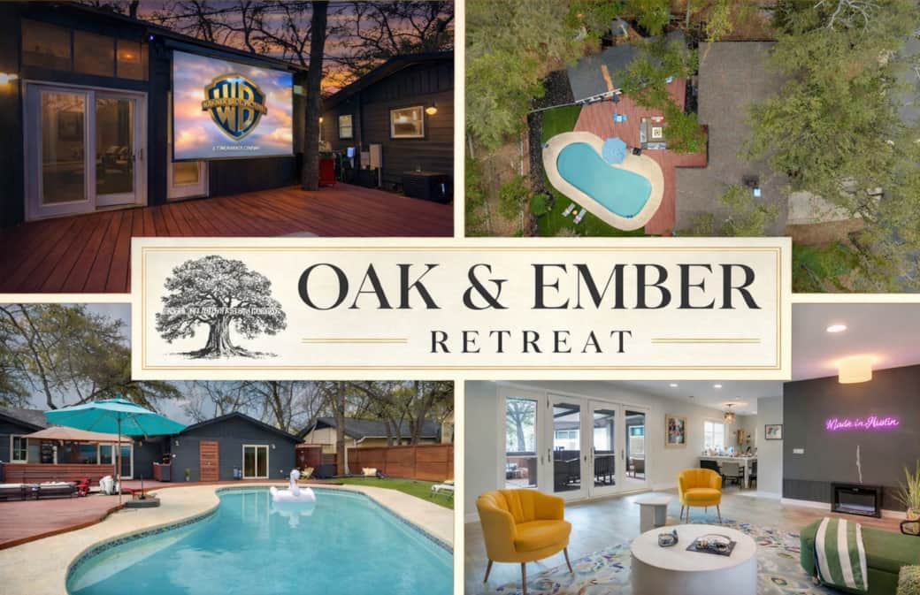 Tucked beneath mature live oaks, Oak & Ember Retreat is a warm, stylish estate designed for memorable group stays. With a sparkling pool, detached guest house, outdoor kitchen, fire pit, and built-in movie screen, this property delivers the kind of laid-back luxury that turns a weekend away into a full experience.